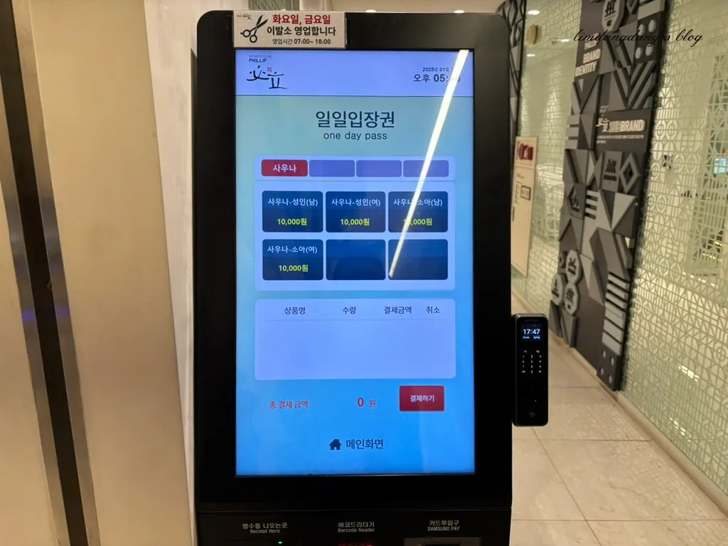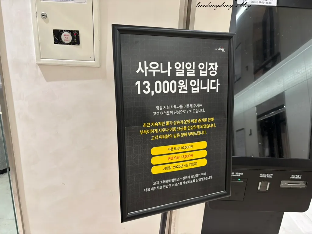 대중사우나는 L층에 있습니다. 지하1층이라고 보면되는데요. 엘레베이터를 타고 한 층 아래 내려가면 바로 게이트앞과 키오스크를 확인할 수 있습니다. 제가 예전에 다닐때만해도 목욕탕에는 입구에서 입장권 끊어주시는 분이 있었는데, 요즘은 다 이렇게 바꼈을까요?