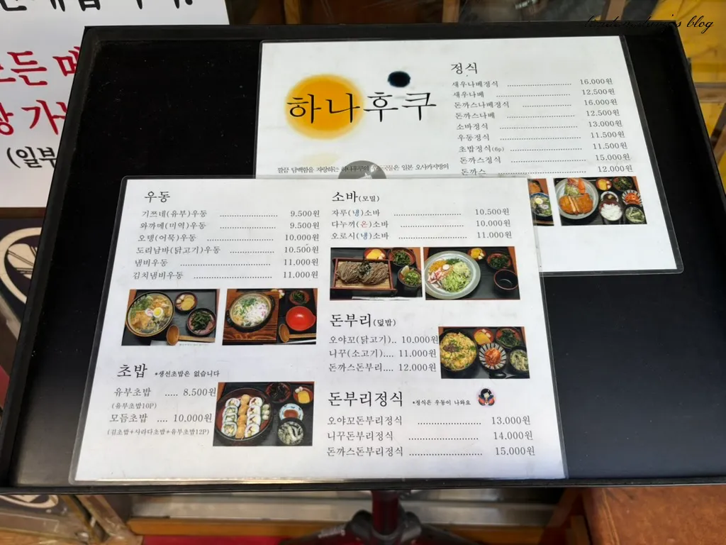 | 메뉴 가격 | 오야꼬(닭고기)덮밥 10,000원 돈까스돈부리 12,000원 돈까스 12,000원 돈까스나베 12,500원 가쯔네(유부)우동 9,500원 오로시(냉)소바 11,000원 자루(냉)소바 10,500원 |
