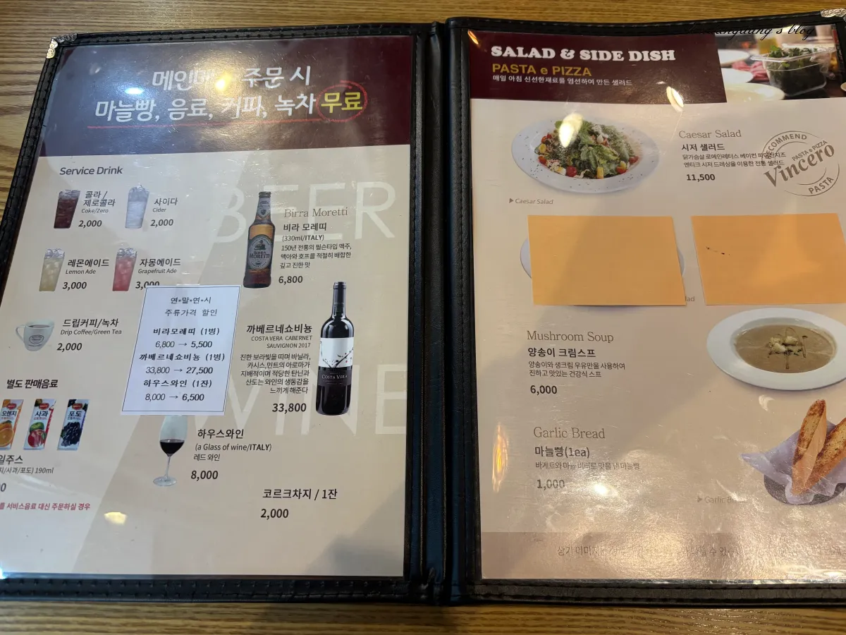| 메뉴 | 시저 샐러드 11,500원 빈체로 파스타 15,500원 버섯 크림 리조또 12,500원 ... *메인 메뉴 1개당 마늘빵, 음료 무료 제공 |