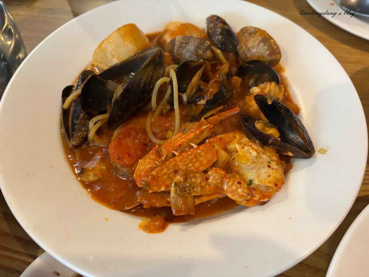 주문한 빈체로 씨푸드는 빈체로 대표 스파게티라고 해요. 메뉴판 보자마자 해산물 양에 압도되어 시켰는데요. 사진과 같이 실제로 나온 음식도 해산물이 꽤 많았고 양이 엄청 푸짐해서 1인분의 양을 넘는 듯했습니다. 식재료도 푸짐하게 관자, 홍합, 게, 바지락 등이 푸짐하게 들어갔고요. 맛도 신선한 식재료의 맛이 느껴졌고 맛있게 먹을 수 있었습니다.