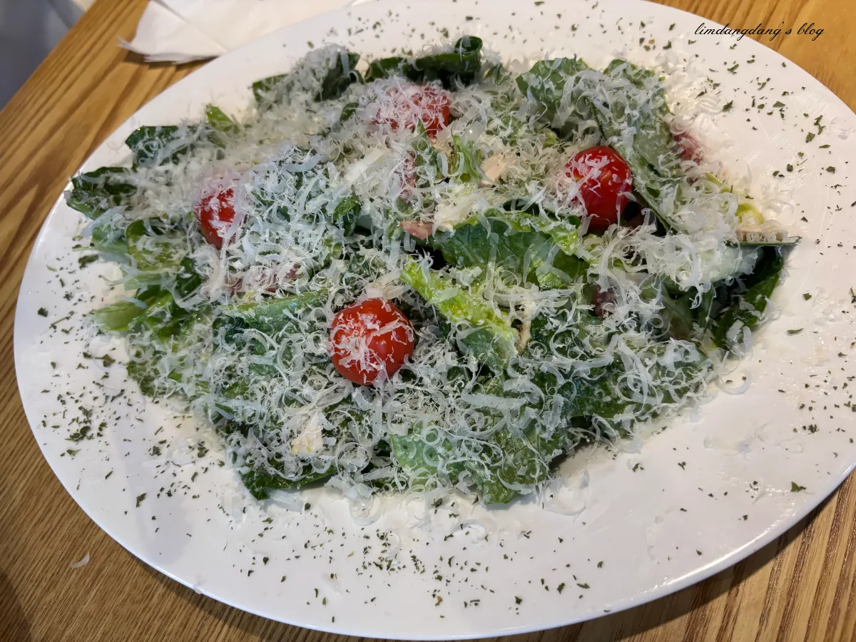 닭가슴살과 베이컨, 파마산 치즈과 함께 시저 드레싱을 이용한 샐러드인데요. 보기에도 멋졌고 파스타와 함께 먹기 좋았습니다. 샐러드 양 또한 많네요.