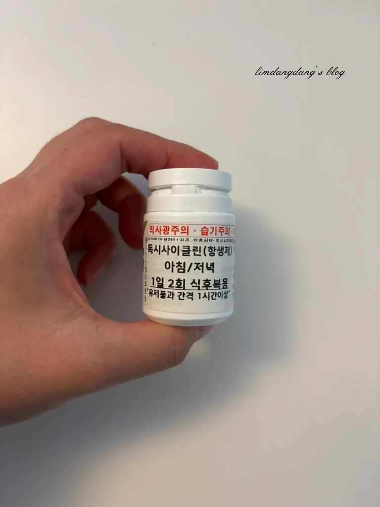 처방받은 항생제는 하루에 아침,저녁으로 2주 동안 먹어야했다. 항생제는 유제품(우유), 제산제 및 영양제(칼슘, 철분, 아연 등)과 1시간 간격을 두고 복용해야한다.