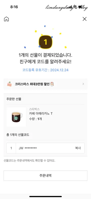 생성된 코드를 복사하여 선물하고자 하는 분께 전달합니다.