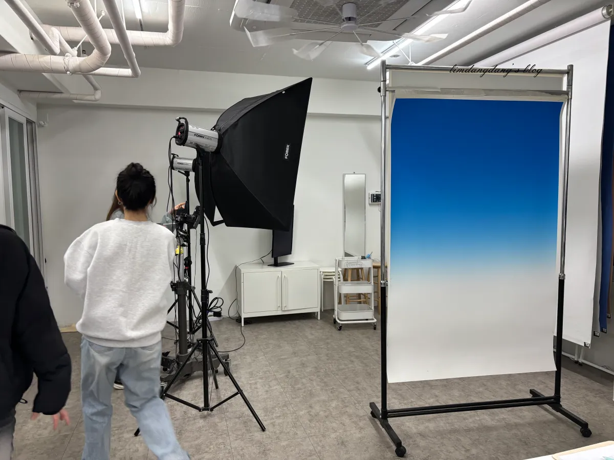 스탭은 세 분이서 진행이 되었는데요. 한 분은 촬영작가님, 한 분은 사진 보정해주시는 분, 한 분은 사전에 사진배경 선택 및 출력 크기 선택, 계산을 도와주세요. 각자 역할이 분담되어서 빠르게 촬영이 가능했습니다. 이미 새학기를 준비하는 중학생, 고등학생들이 증명사진을 찍으려고 많이 대기를 하더라고요.