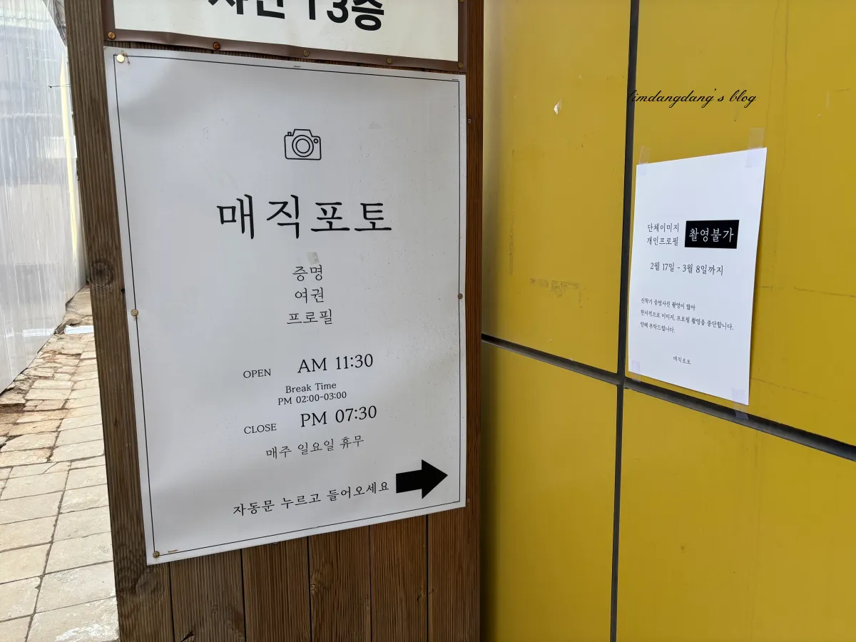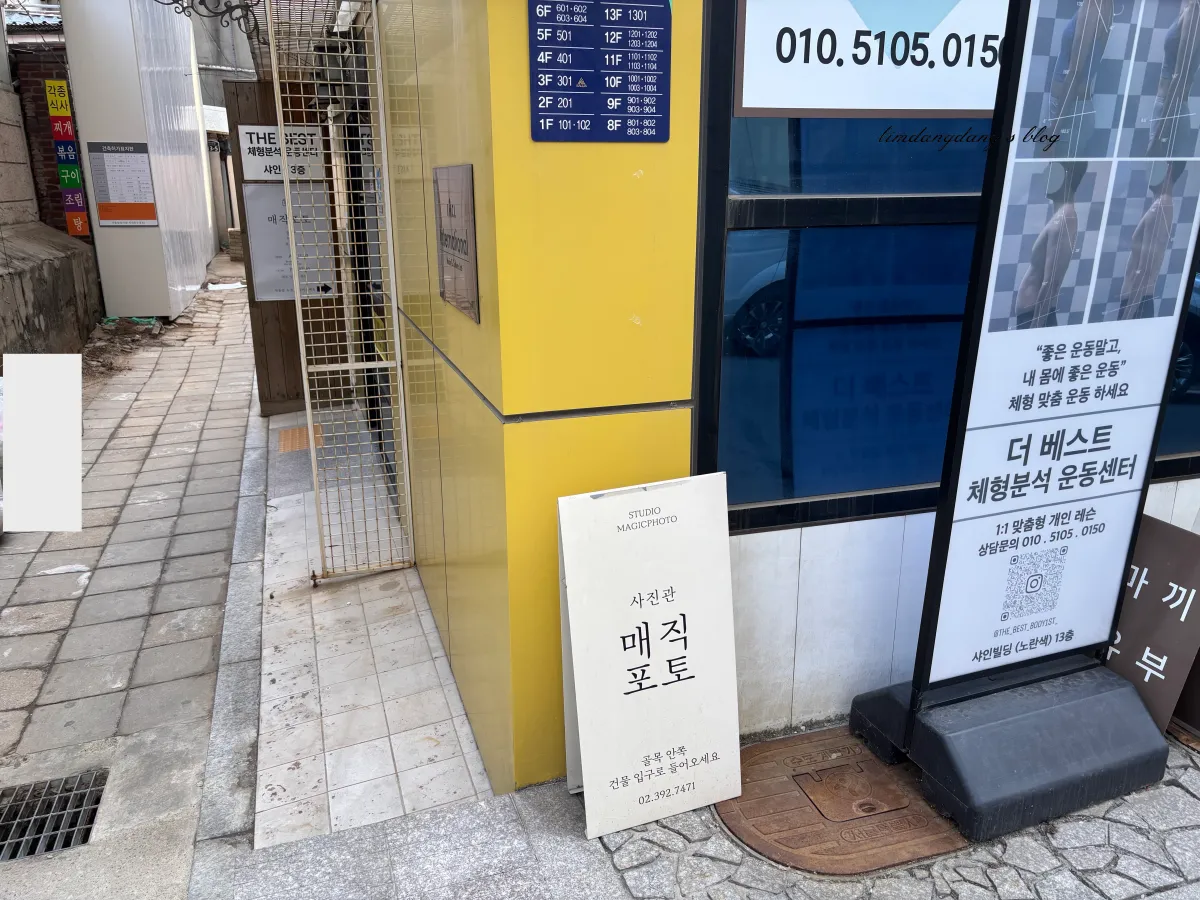 건물의 간판이 그리 크지 않기 때문에 지도를 이용하여 잘 찾아오셔야되고요. 건물에 다다르면 매직포토 간판이 보이게 되는데요. 골목 안쪽으로 들어가면 건물 입구가 보여 2층으로 올라가면 됩니다.