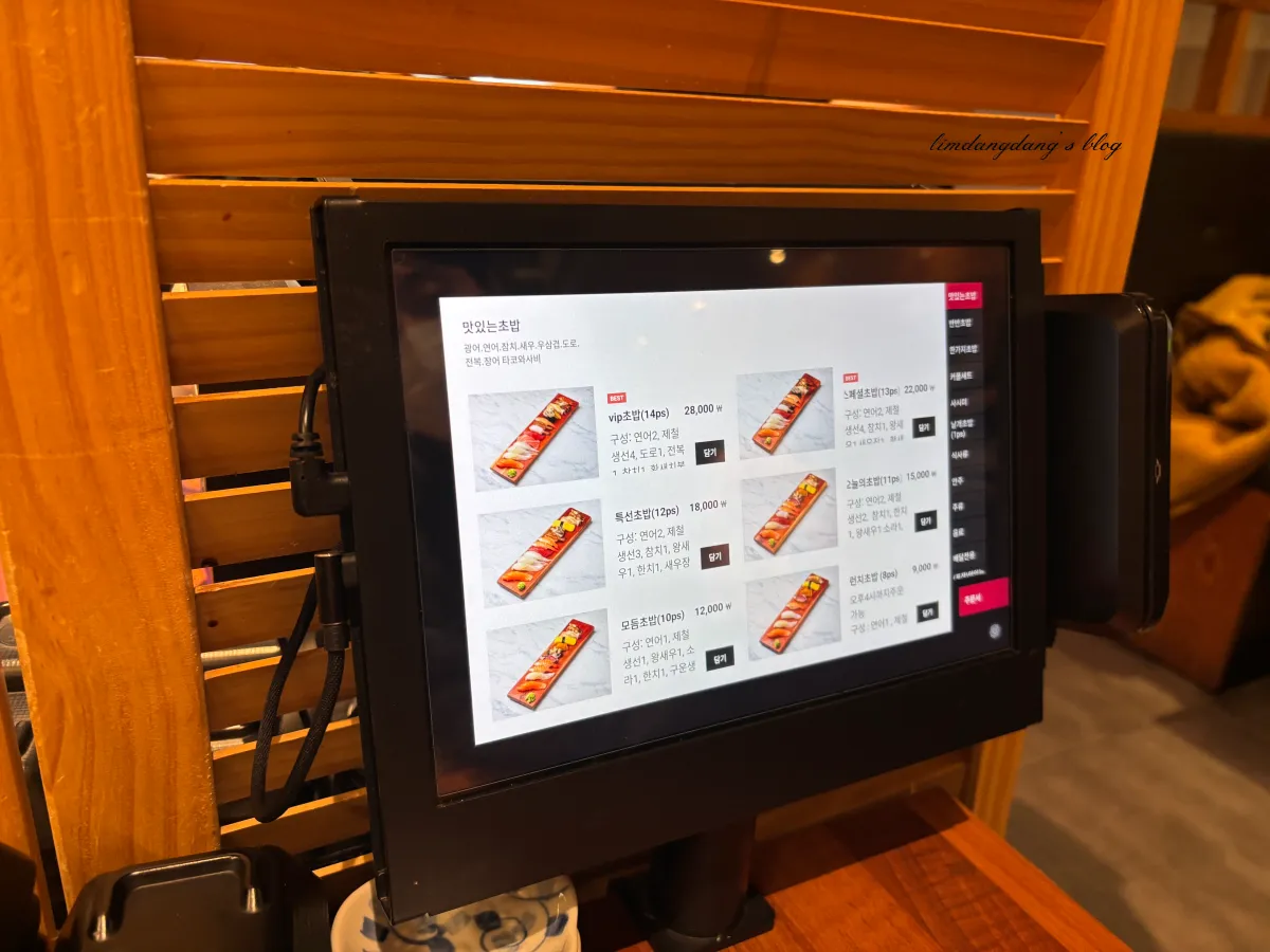 이 초밥집은 사람들이 워낙 많이 왔다 가서 그런지 엄청 체계적이라는 느낌이 있어요. 물론 이렇게 테이블오더도 가능합니다. 메뉴 담기를 하면 우동, 메밀을 추가할지 선택사항이 나옵니다. 우동 혹은 메밀 추가는 각 천원씩이고요. 초밥메뉴 한개당 한개씩만 추가가 되요.