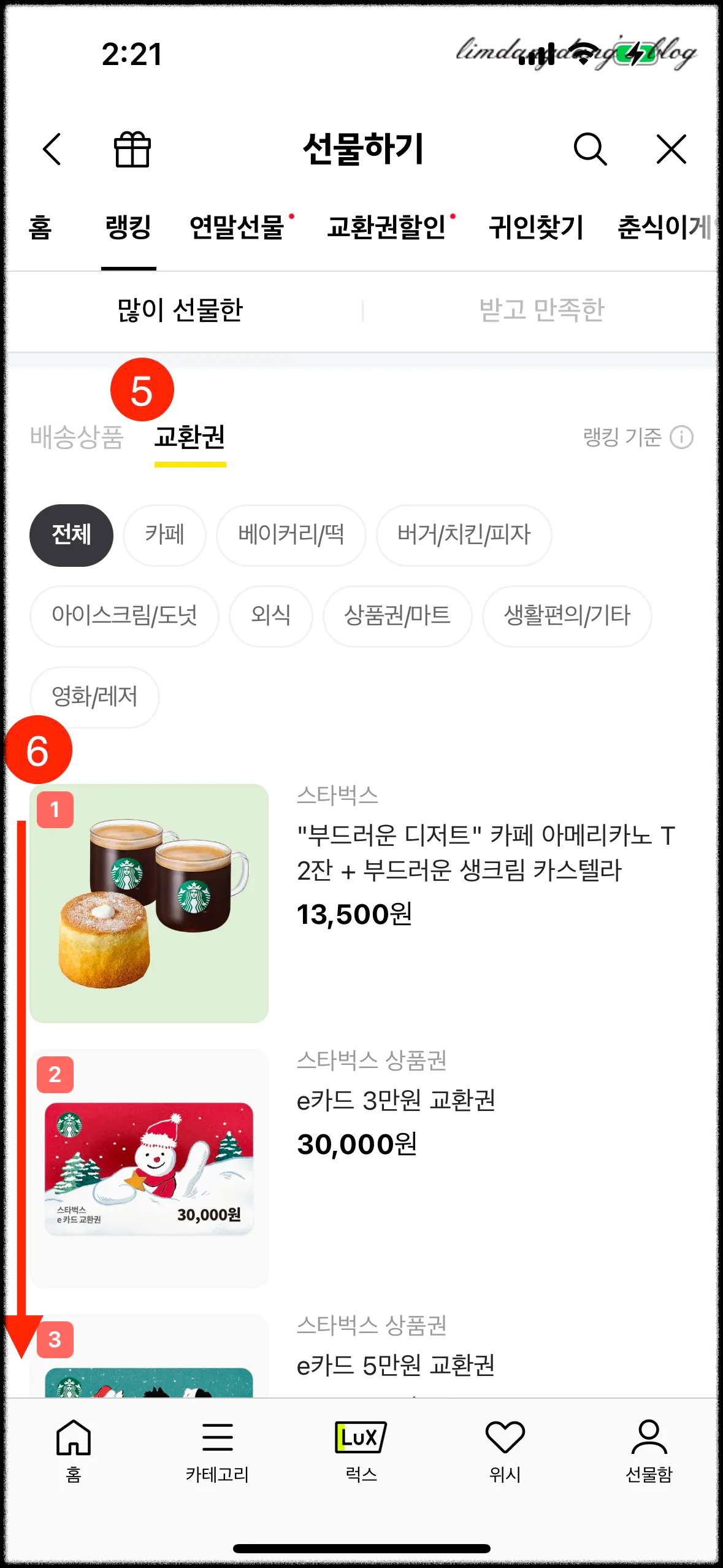 랭킹화면으로 들어오면 배송상품, 5. 교환권을 선택할 수 있는데요. 사람들이 많이 구매하는 6. 순위가 나오게 됩니다. 쭉 내려서 7. 스타벅스 아이스 카페 아메리카노를 쉽게 찾을 수 있을겁니다. 오늘은 스타벅스 커피를 구매하는 방법을 알려드리오니, 선호하시는 선물로 선택해주시면 됩니다.