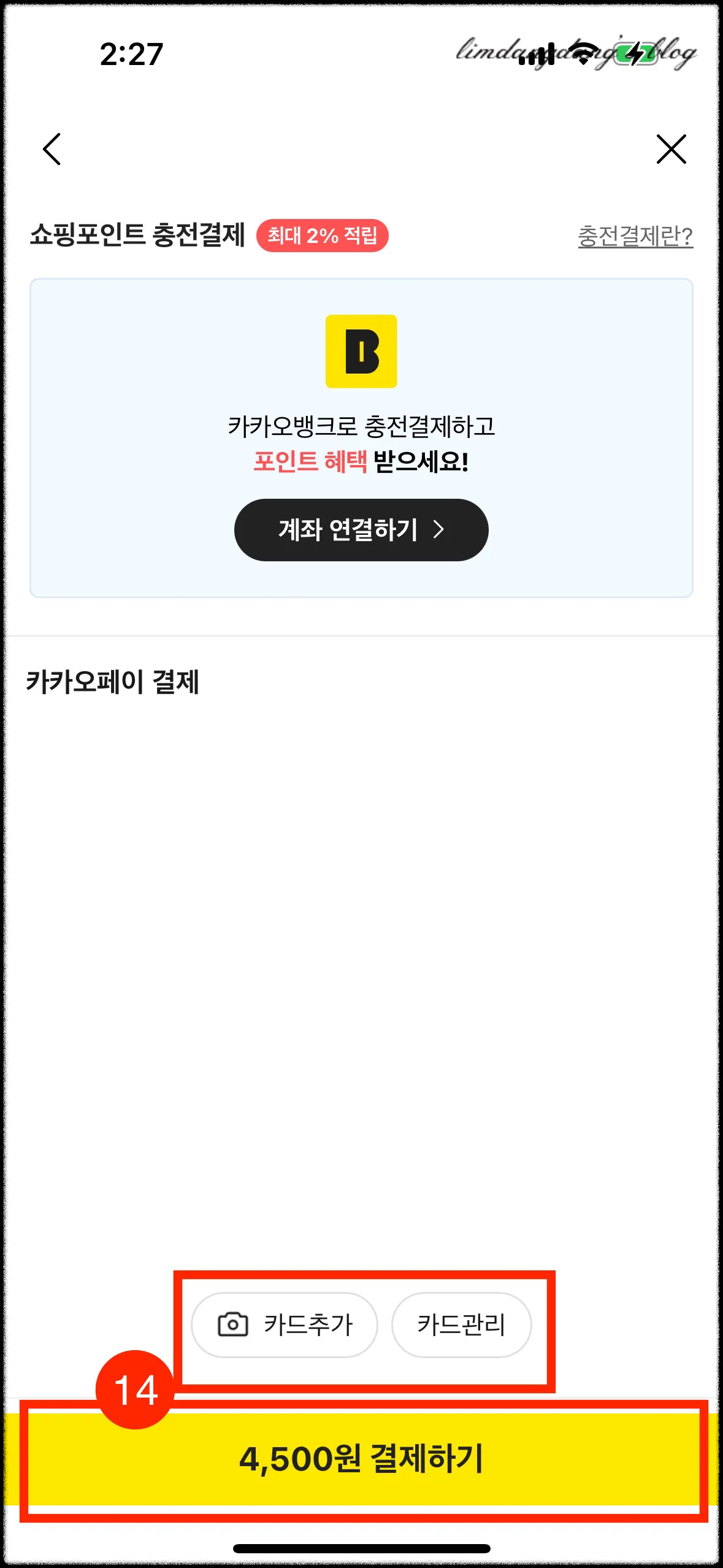 친구까지 선택이 완료되면, 11번과 같이 카드 종류를 선택할 수도 있고, 12. 메시지 내용을 작성하거나 혹은 음성으로도 추가할 수 있습니다. 메시지를 작성한 후 13. 결제하기를 누릅니다. 결제 화면으로 이동하여 카드가 연결이 되지 않았다면 카드추가를 통해 카드를 연결하거나 혹은 계좌를 연결해 줍니다. 결제방법이 등록이 되면 14.결제하기를 눌러 결제를 완료합니다.
