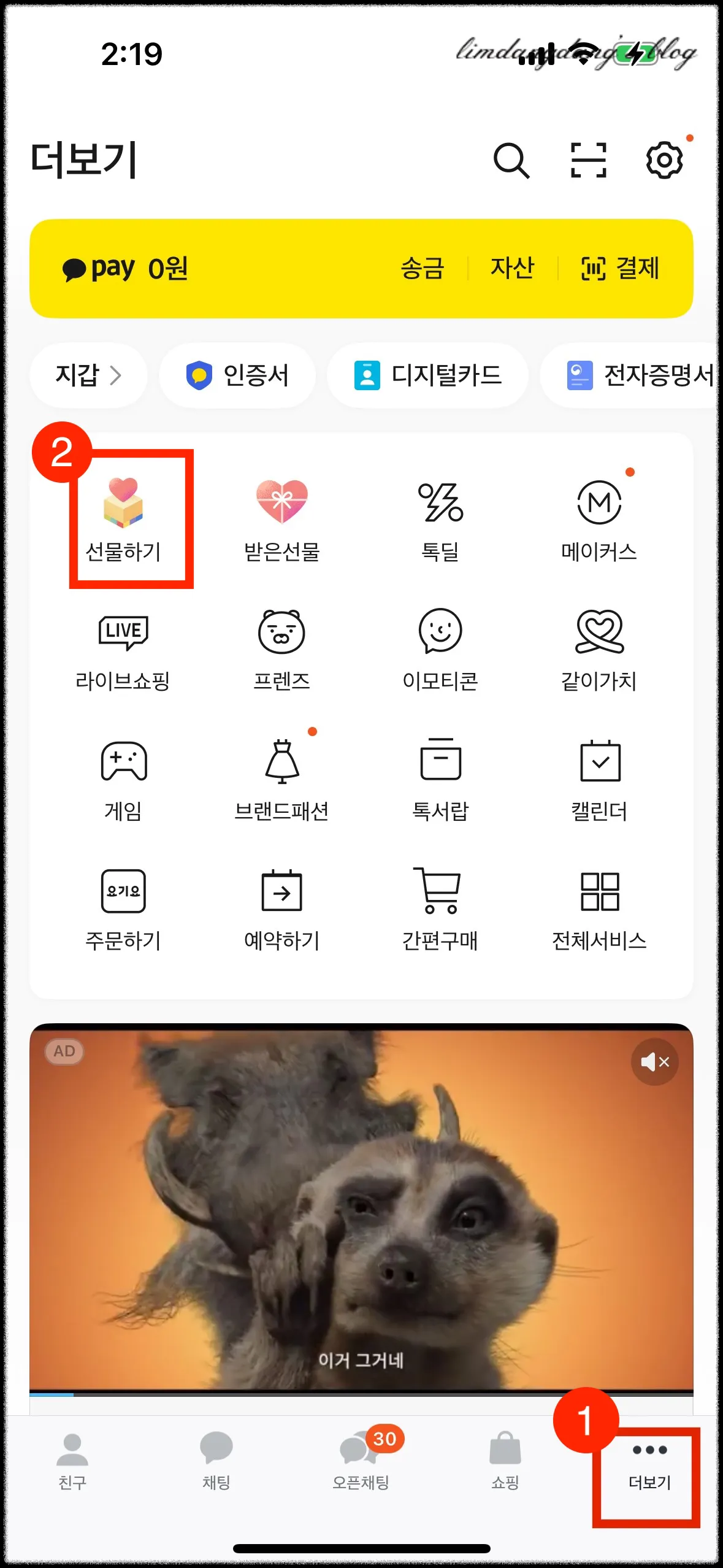 카카오톡 화면에서 1. 더보기 로 들어가서 2. 선물하기 로 들어갑니다.